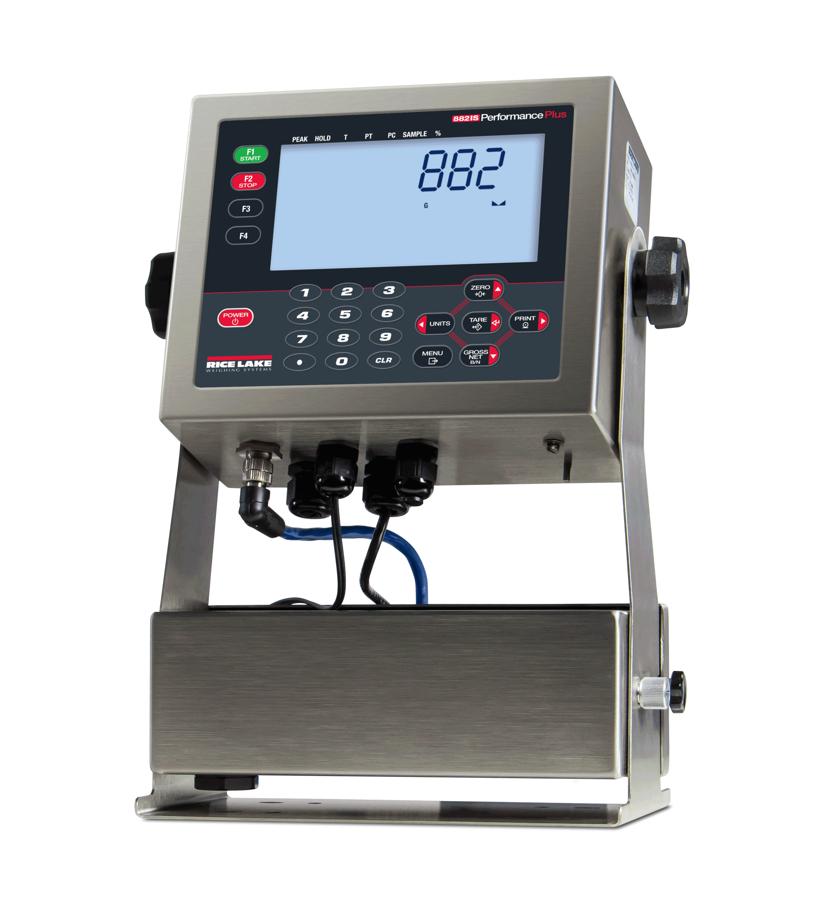 Indicator,882IS 7.5 VDC SST Enclosure 5 Button Keypad With A/C Power Supply. 115-230VAC with metric thread adapter (1/2NPT - M20) The 882IS is designed and approved for use in specific Hazardous (classified) areas by by Factory Mutual(FM). These areas are classified by the NFPA, National Electric Code(Article 500) as: Class I,II,II Divisions 1 or 2 GROUPS ABCDEFG T4 and Class 1 Zone 0 AEx/Ex ia IIC T4 Ga Zone 21 AEx/Ex ib IIIC T135C Ta = -10C to 40C(14F to 104F) and ATEX/IECEx II 1G ia IIC T4 Ga II 2D Ex ib IIIC T135C Db. It is the responsibility of the reseller to keep a permanent traceable record of the location(end user) of the Equipment or return a completed Rice Lake Weighing Systems "Hazardous Area Classification Form" signed byu the reseller and the end users Hazardous (classified) area defining authority for our acceptance and permanent record. Proper specification, installation, operation and service are the responsibility of the end user. Any field modification of tghe product voids any and all warranty and FM Approval.