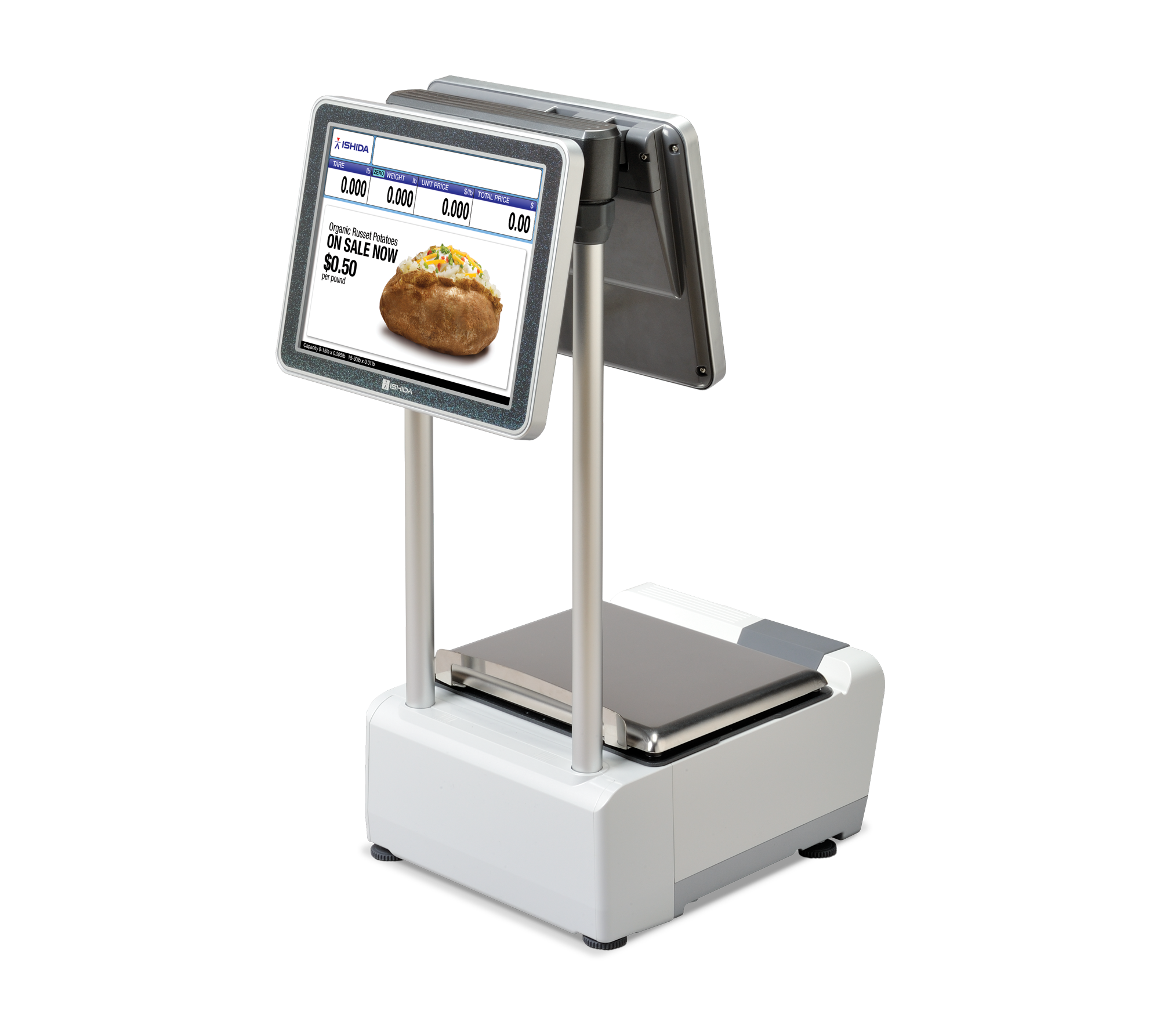 The pole and short pole models’ low-profile base combined with larger display screens is optimal for keeping eye contact with customers and still providing an ergonomic setup for employees. The short pole model is for use on the countertop, providing a 12-inch display for customer view while offsetting an easy-to-use touchscreen display behind the counter. The pole scale model is used behind the counter, providing a raised customer display above the countertop.