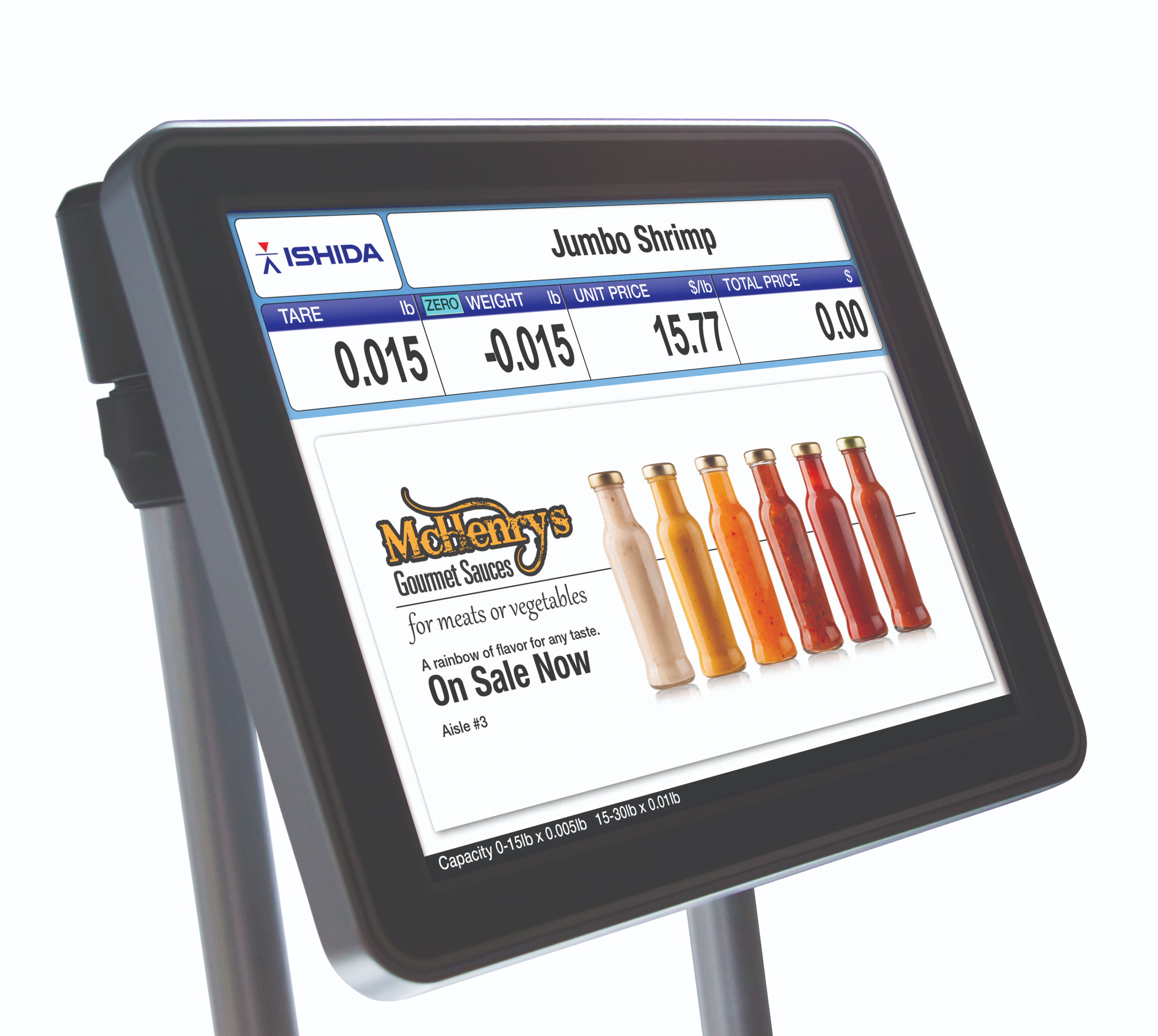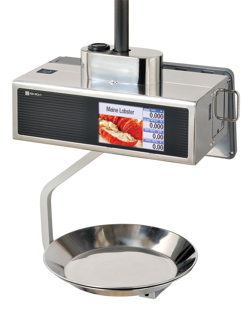 The suspended ergonomic design of the Uni-9 hanging type follows quickly on the heels of the first color touchscreen hanging scale on the market, Ishida’s Uni-7 hanging scale. Ideal for seafood and other high-moisture foods, the suspended design keeps product away from the operator touchscreen, which resounds with a beep when buttons are pressed. Customers and employees alike will find the large 12-inch display easy to read and use.