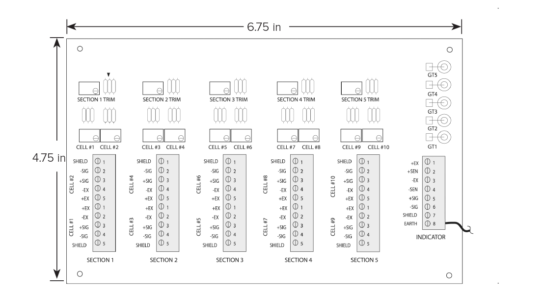 The JB1010T with transient protection provides easy access for trimming up to ten load cells per unit or conveniently adjust multiple cell modules by section.