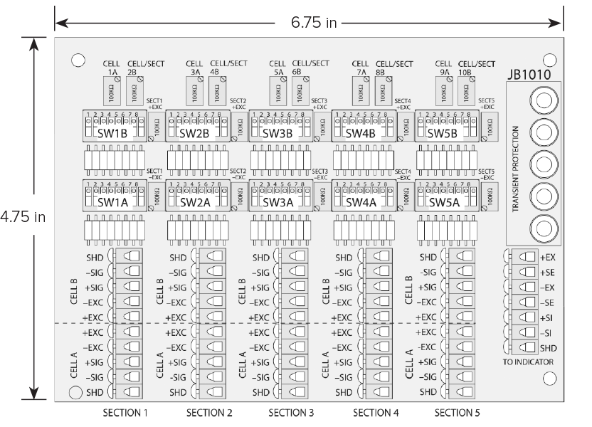 When trimming junction boxes for paralleling load cells, the JB1010 provides signal or excitation trim capabilities. Whether expanding an existing scale or replacing a junction box on a truck or floor scale, the JB1010 provides easy access for trimming up to ten load cells per unit or conveniently adjust multiple cell modules by section.