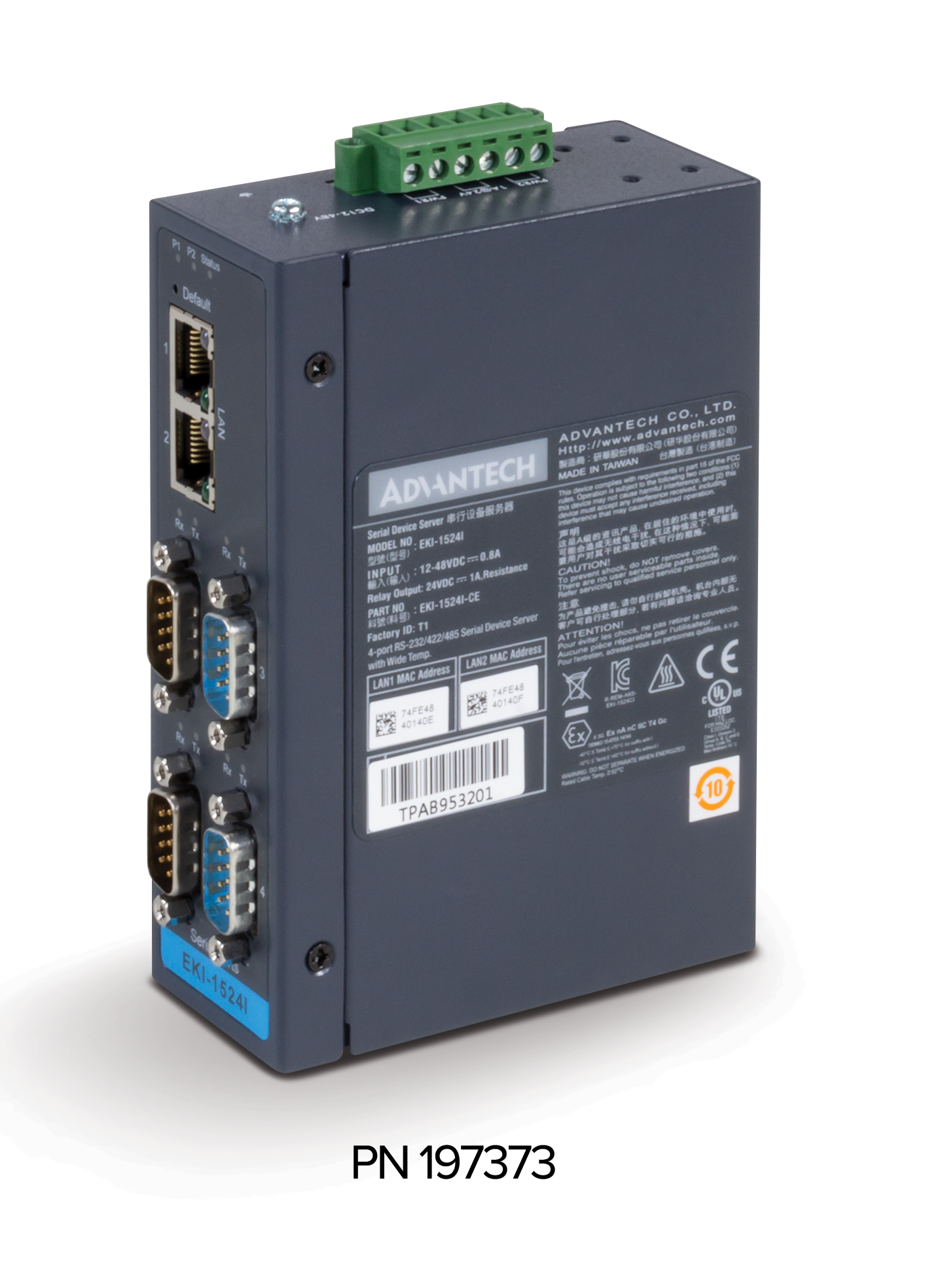 | 197373 | Ethernet Serial Server four serial port (DB-9) one Ethernet 10/100 (RJ45) DIN rail mounting. |
