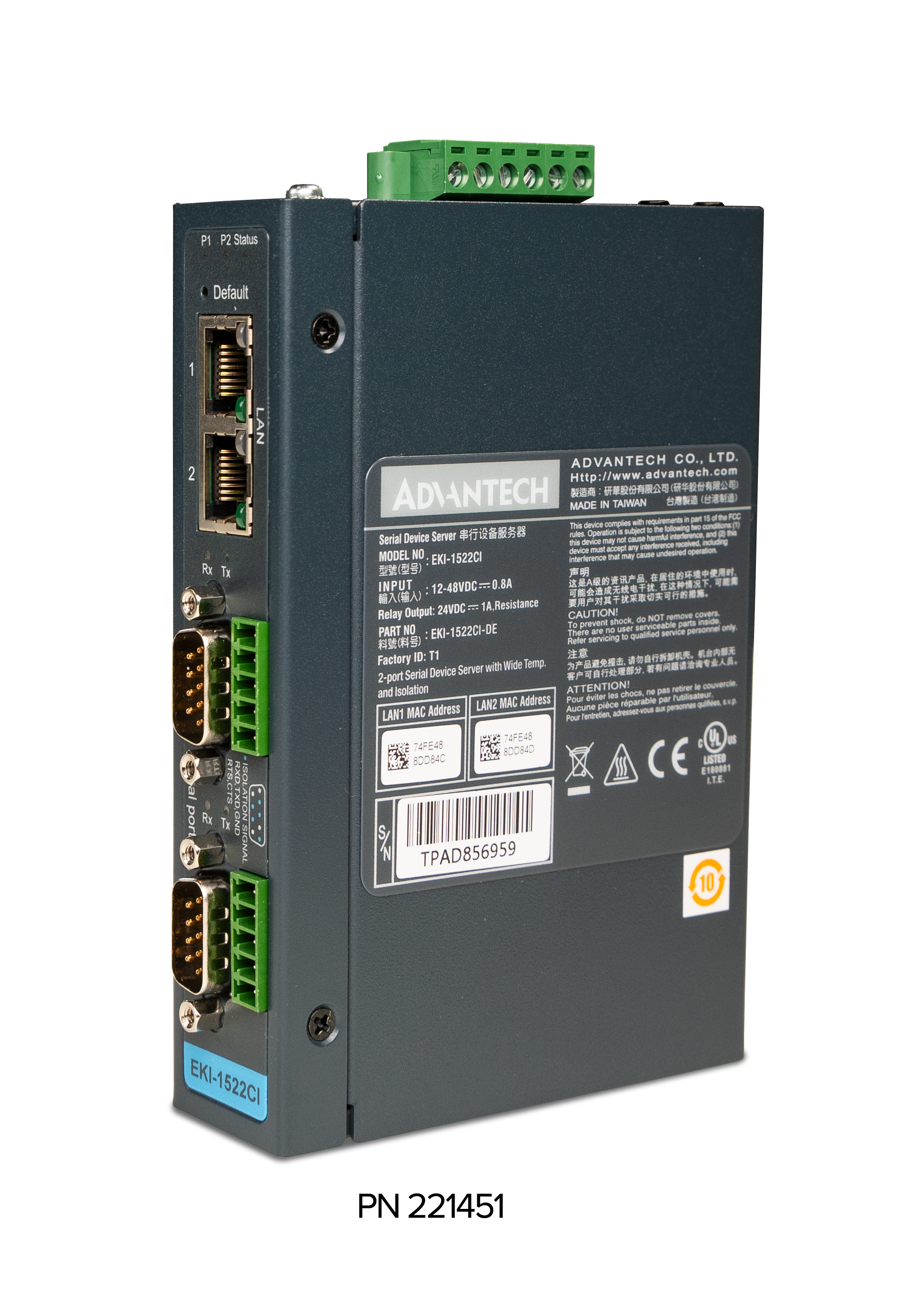 | 221451 | Ethernet Serial Server Dual serial port (2-9 pin connectors)1 Ethernet 10/100 (RJ45) DIN rail mounting. (2x5 pin terminal blocks for RS422/485 only) |