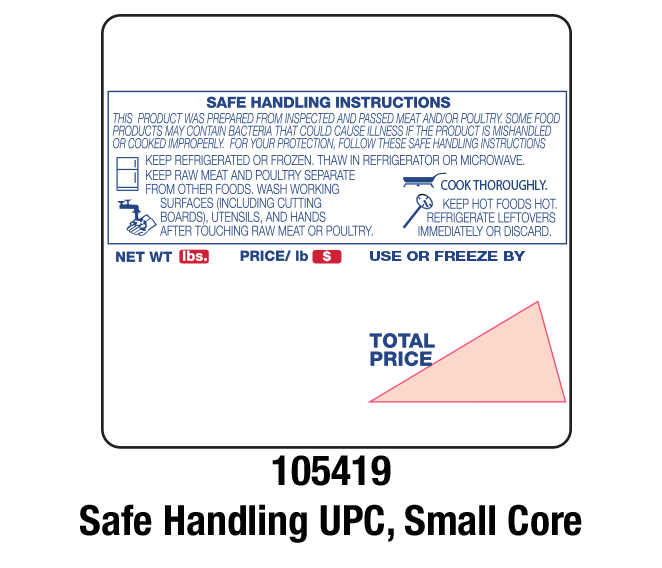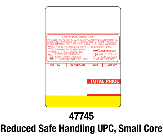 | 47763 | 64 × 85 mm (2.52 × 3.34 in) pre-printed with safe handling instructions, 3 in core, 9 in outer diameter | 2,500 labels/roll | 5 rolls/case |