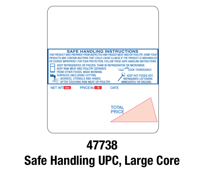 | 47738 | 64 × 59 mm (2.52 × 2.32 in) pre-printed with safe handling instructions, 3 in core, 9 in outer diameter | 3,600 labels/roll | 5 rolls/case |