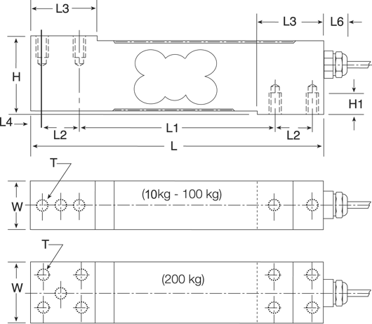 Low-profile, off-center loading load cell. Designed for direct mounting on weighing platforms, hanging scales and other low-capacity beam applications. Stainless steel construction with a humidity-resistant protective coating provides long-term stability, even in harsh environments. Potted cavities provide improved performance in damp environments. Capacities range from 10 to 200 kg. Complete with 10 ft of load cell cable. The 100,000 and 200,000 kg capacities are not NTEP Certified.