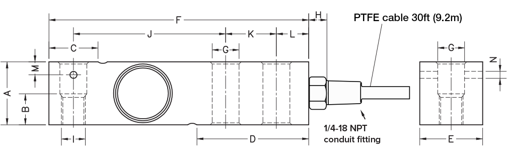 A stainless steel single-ended beam with 2 mV/V and 30 ft of PTFE jacketed cable. Hermetically sealed to IP69K standards, perfect for tough environments. Available capacities from 1,000 to 10,000 lb.