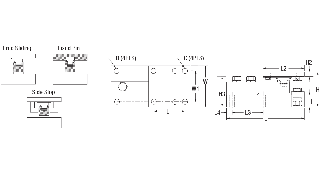 - One fixed-pin module, one side-stop module, and one or two free-sliding assemblies. Each module is complete with a Flintec SB4 stainless steel hermetically sealed load cell.