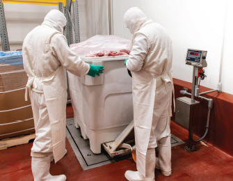 Throughout the facility, employees are held to the highest standard of sanitation. Full-body clean suits are worn by those in contact with or near pork as it is received, handled and packaged. Sanitary masks, gloves and boots complete the ensemble, revealing only an employee’s eyes to distinguish one individual from the next. However, the strict standards do not stop there.