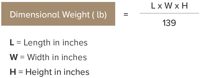 The Formula for Dimensional WeightOnce the length, width and height are found, dimensional weight can be calculated using the dimensional weight formula. To calculate dim weight, multiply the shipment’s length by its width and height, in inches. Then, divide it by the DIM factor established by the carrier, typically 139. The result is the package’s dimensional weight in pounds. |