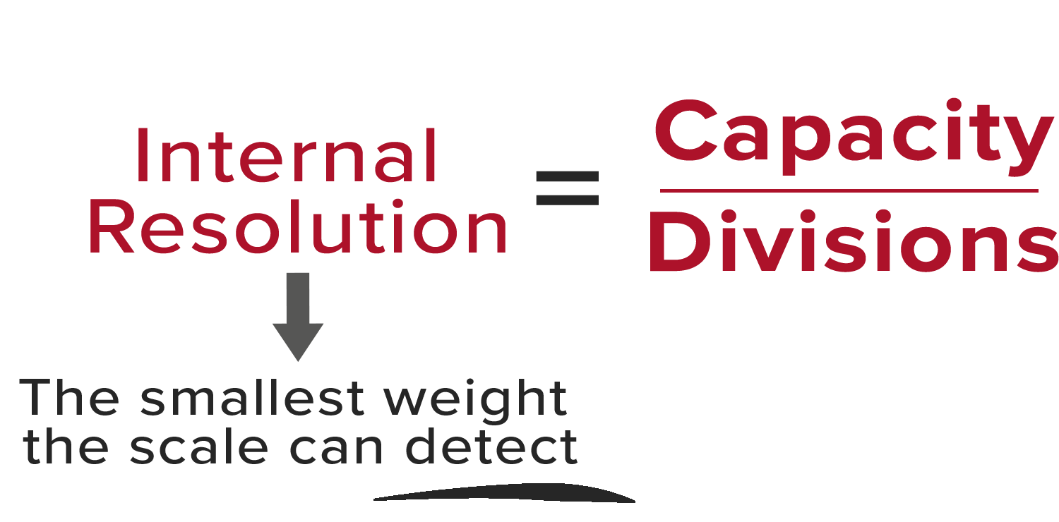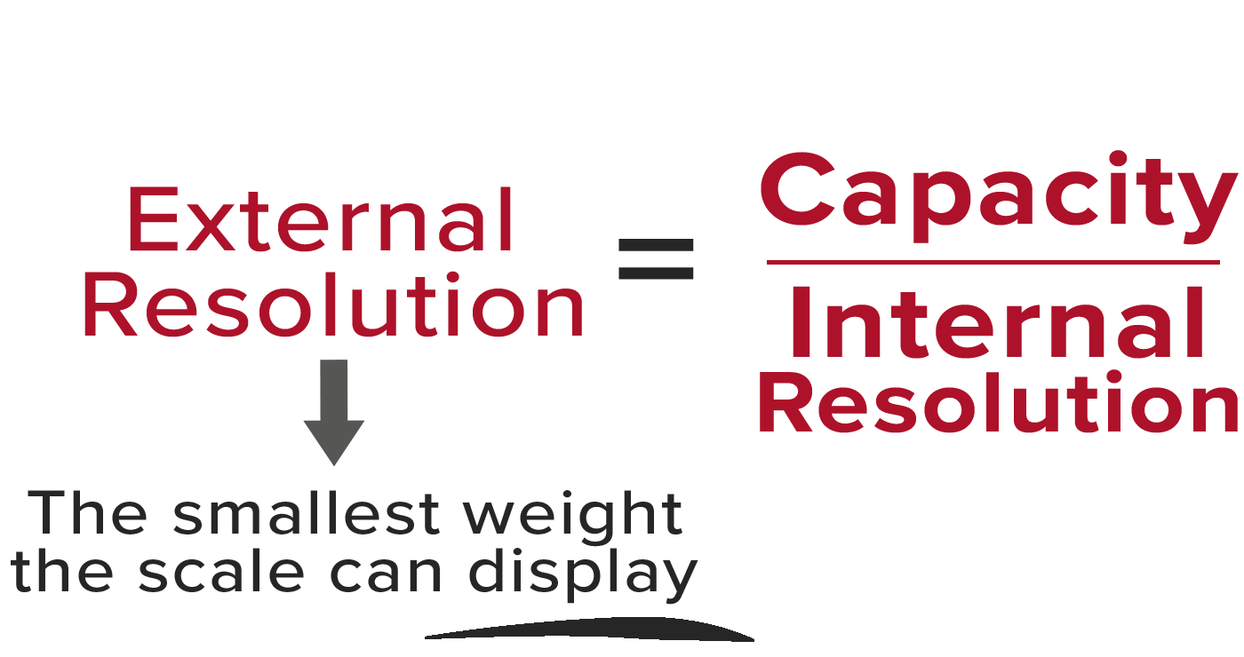 Considering the previous examples, if some screws were placed on the scale and the internal count was 210, the weight would be calculated as 0.01050 pounds because the internal count is multiplied by the internal resolution of 0.00005. The external resolution would be read as 00.01 if the desired amount of decimal points was set to five digits. The software automatically rounds off.