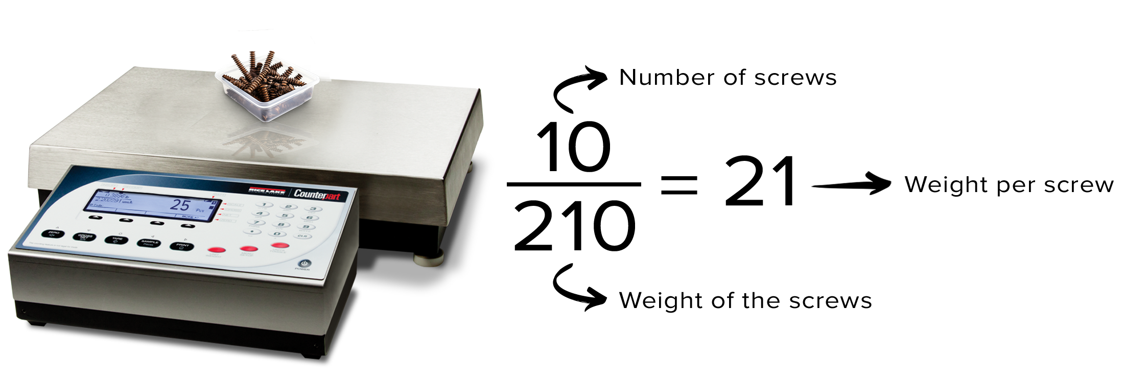 The operator can sample quantities to ensure the scale is counting correctly. After keying in sample quantity—10 pieces, for example—the scale still “knows” how many internal counts are being used (210). To determine how many internal counts per piece, the internal count is divided by the sample quantity. Or, 210 ÷ 10 = 21.
