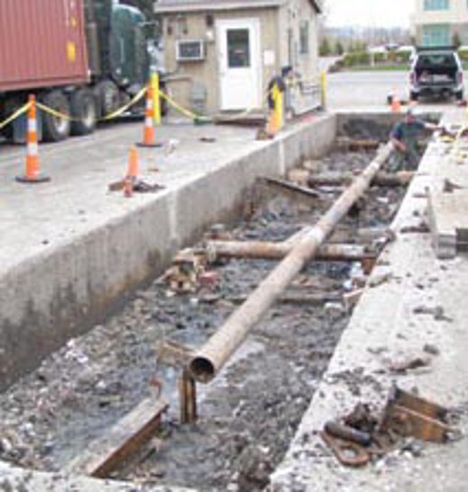 "We knew we had to solve the site drainage problem first. There was a trough through the parking lot and the runoff seeped into the scale pit. We broke open the side of the trough and core-drilled an eight-inch hole into the side of the scale. We installed a vault with a manhole and connected it to the scale with a six-inch pipe. A three-inch discharge pipe was installed that led from the pump in the manhole to the trough. Next we shoveled out and pressure-washed the pit and epoxied exposed rebar to reinforce the concrete pillars and hold them to the walls and poured the concrete for the stands.