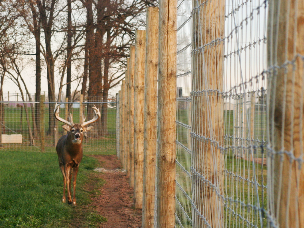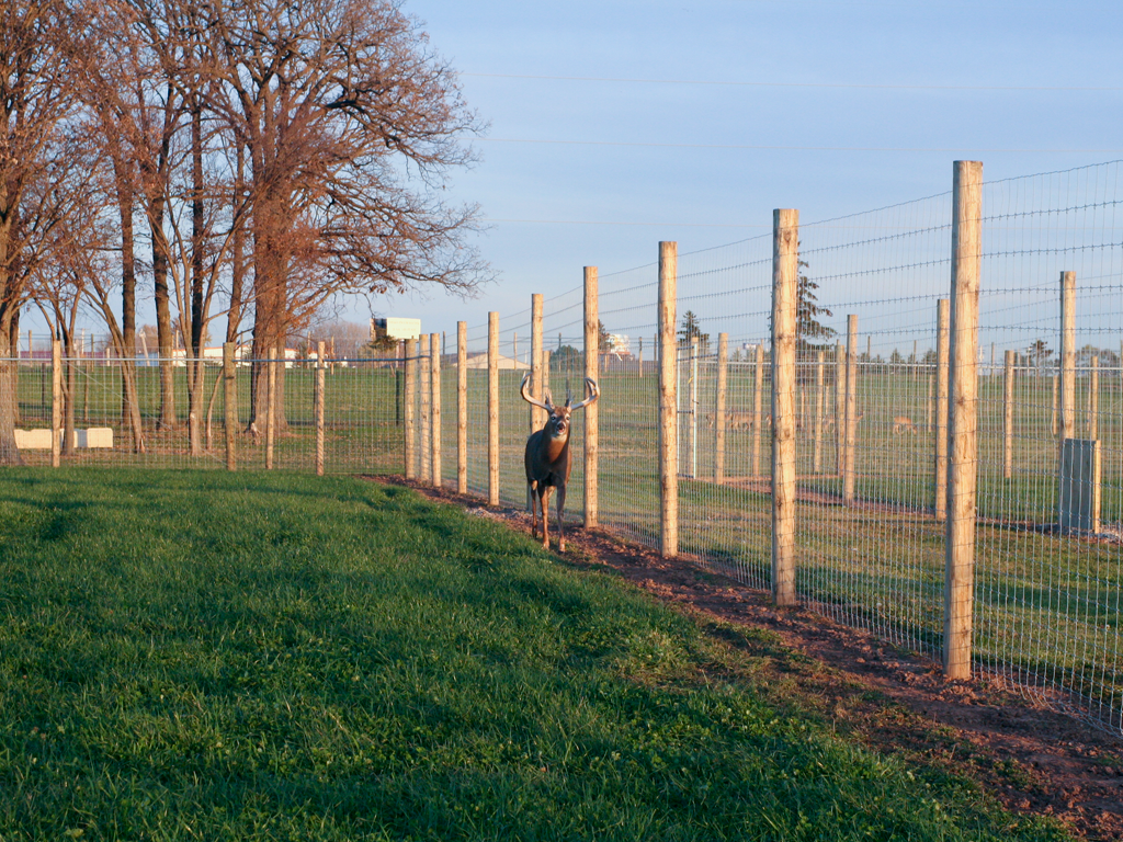 Beyond the perimeter fence, there are patches of torn-up sod. “A wild deer has been here. That patch is where he displayed dominance. With 52 does in heat, we’re bound to attract attention. One year a wild buck stayed here three days.”