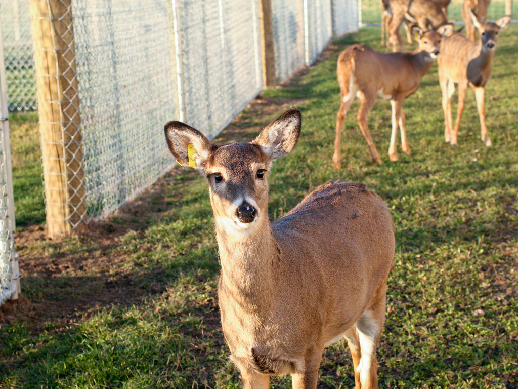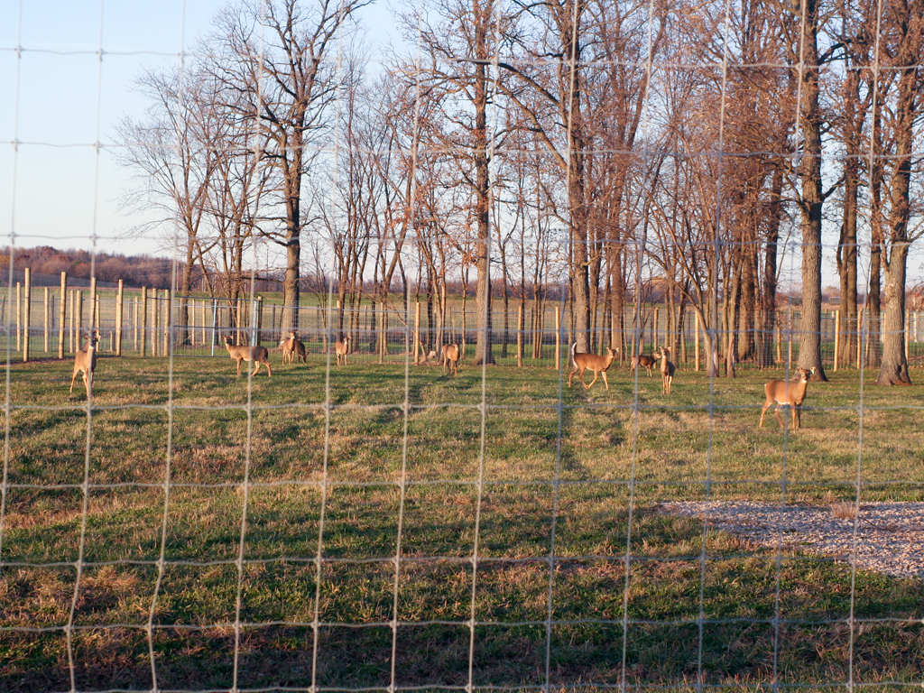 “We pull the females away from the does after two days, so they still get the colostrum.” Colostrum is the milk produced just prior to giving birth that contains antibodies, as well as being lower in fat and higher in protein than milk produced later on. Newborn fawns have small digestive systems, and colostrum delivers nutrients in a concentrated low-volume form. “Then we bottle-feed them three times a day for two months and wean them slowly. They stay inside in smaller pens for the first ten days after birth. Then we carry them outside to one of these 30- by 50-foot pens.”