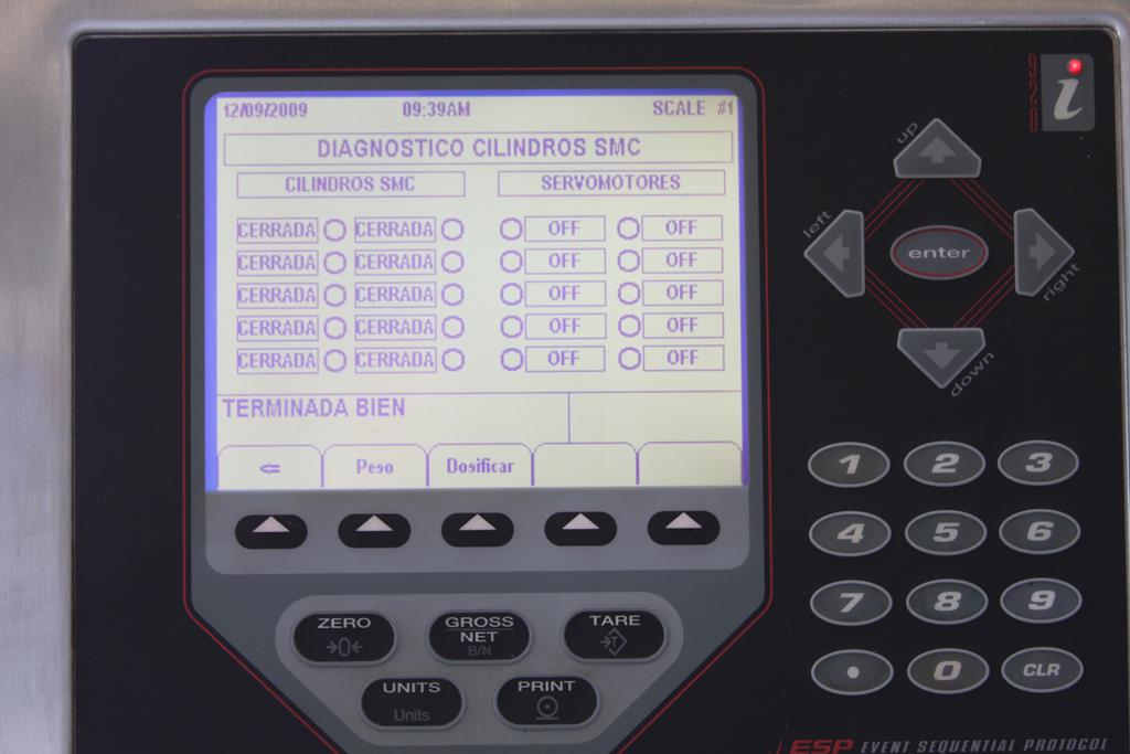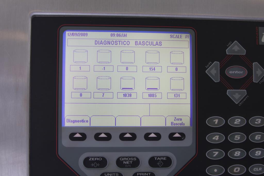 Ruben and company have programmed the Rice Lake 920i to control a network of five PLCs with an industrial computer that supervises the process and the movement of the robotic cart. The mix recipes are stored in the computer database. The 920i receives the formula and instructions to control servo motors. The servos move screw augers as little as one degree, or one pulse, to dispense as little as seven kilograms of an ingredient. The robotic cart travels a track below the hoppers. Ruben demonstrated the process: “This is the diagnostic screen. If there is an error, we can locate it on this screen. We can even calibrate the scales through the 920i.”