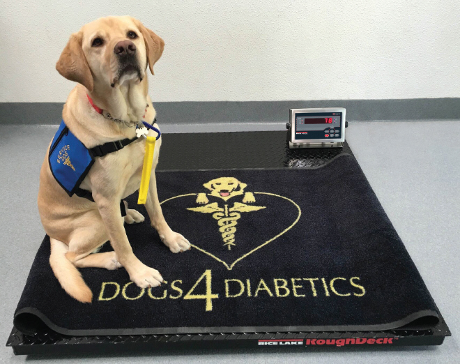 Since day one of Dogs4Diabetics, a vital piece of equipment has been used to ensure Armstrong and other diabetic alert dogs in training are performing at their optimal level—a Rice Lake RoughDeck floor scale. The dogs at the Dogs4Diabetics training facility are taught using positive reinforcement. If a dog correctly alerts its owner of a change in blood sugar, the dog is rewarded with a positive interaction, usually a tasty treat. Handlers then account for these treats when it comes time to feed the dogs their daily meals.