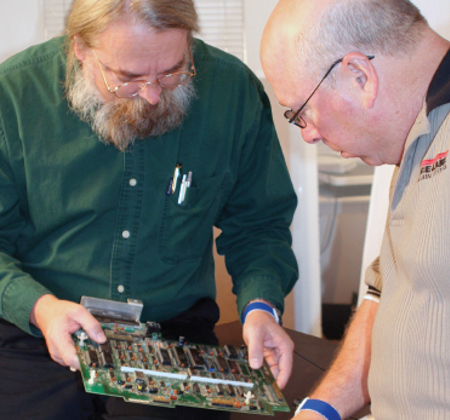 Jim Daggon, senior product manager, and Chuck Crowley, senior technical support, wear static control wrist straps and use a dissipative work surface to protect sensitive components and circuits from ESD. These items are available in our Rice Lake Master Catalog and at www.ricelake.com